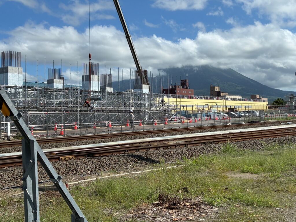 手前は在来線の函館本線(通称山線)の線路、右方向が在来線駅ですが、その向こうの背景は羊蹄山で、新幹線高架橋の橋脚工事が現在真っ盛りです。思っていた以上に進捗している感じです。