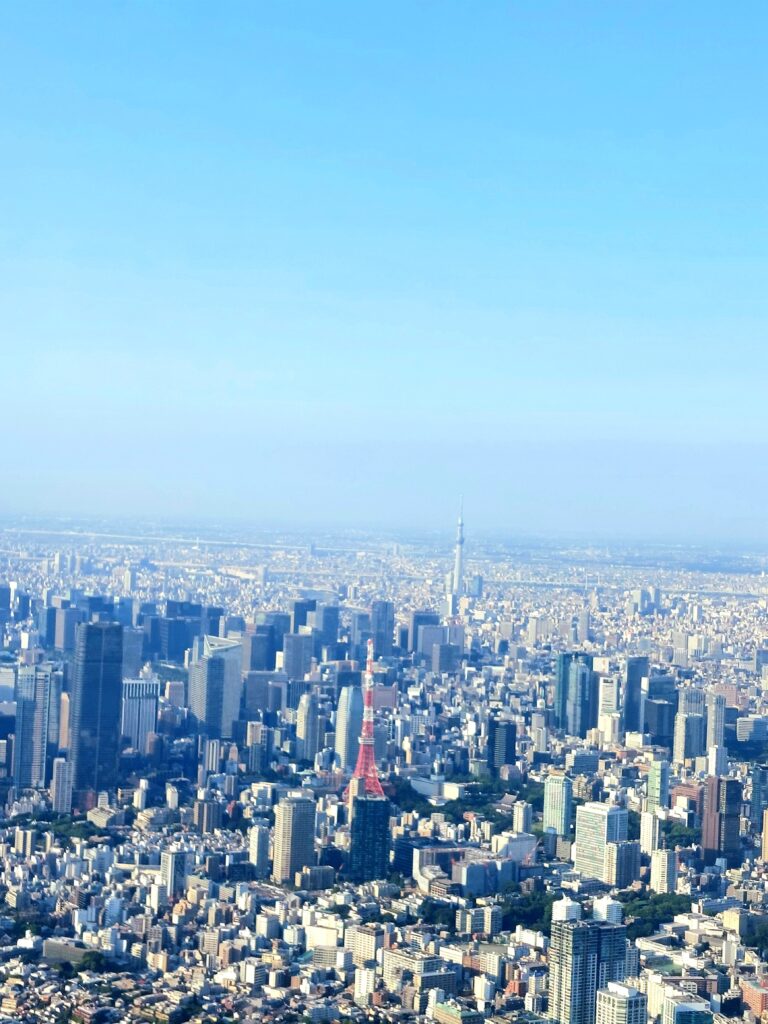 羽田空港へ着陸寸前の機内から撮影した東京都心と、その向こうの密集市街地。