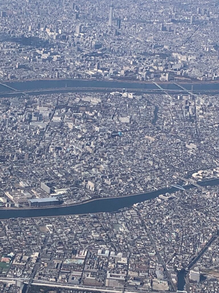 次の写真は、離陸した直後に機内から撮影した荒川周辺の密集市街地です。